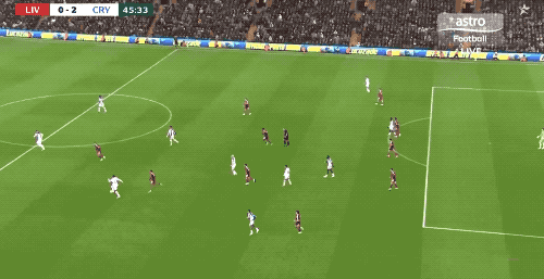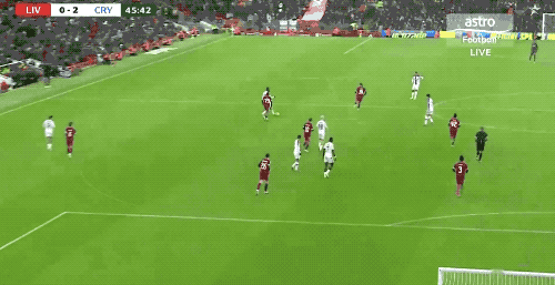 ก่อนหมดครึ่งแรกไม่นาน คริสตัล พาเลซ ทำเกมด้วยการต่อบอลสั้นหลายจังหวะอีกครั้ง ก่อนจะเจาะแนวรับกลางของลิเวอร์พูลได้สำเร็จ และซาร์ก็ยิงประตูที่สองของเขาในเกมนี้เข้าไป