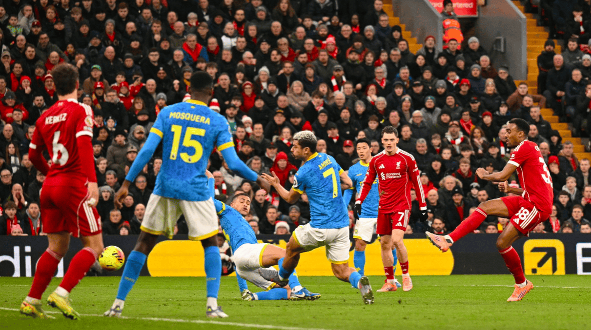 แฟนบอลเจ้าบ้านของลิเวอร์พูลลุกขึ้นยืนปรบมือด้วยความยินดี เพราะนี่คือประตูแรกของวิร์ตซ์ใน 23 นัดที่ลงเล่นให้กับสโมสร นับตั้งแต่ย้ายมาร่วมทีมด้วยค่าตัว 136 ล้านยูโร