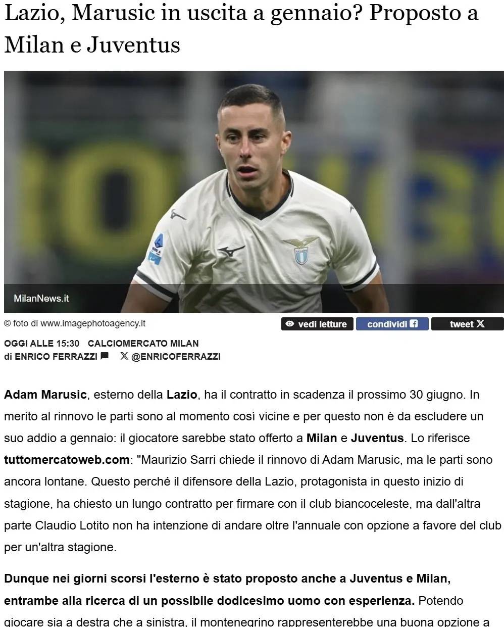 มารูซิช! มาร์ค โนเบิร์ต มารูซิช กองหลังของลาซิโอ ได้ตัดสินใจไม่ต่อสัญญาฉบับใหม่กับสโมสร และจะกลายเป็นนักเตะฟรีเอเยนต์ในฤดูร้อนนี้ มิลาน และยูเวนตุส คือสโมสรที่มารูซิชให้ความสนใจเป็นพิเศษ และเอเย่นต์ของเขากำลังสำรวจความเป็นไปได้ในการย้ายไปมิลานอยู่ในตอนนี้