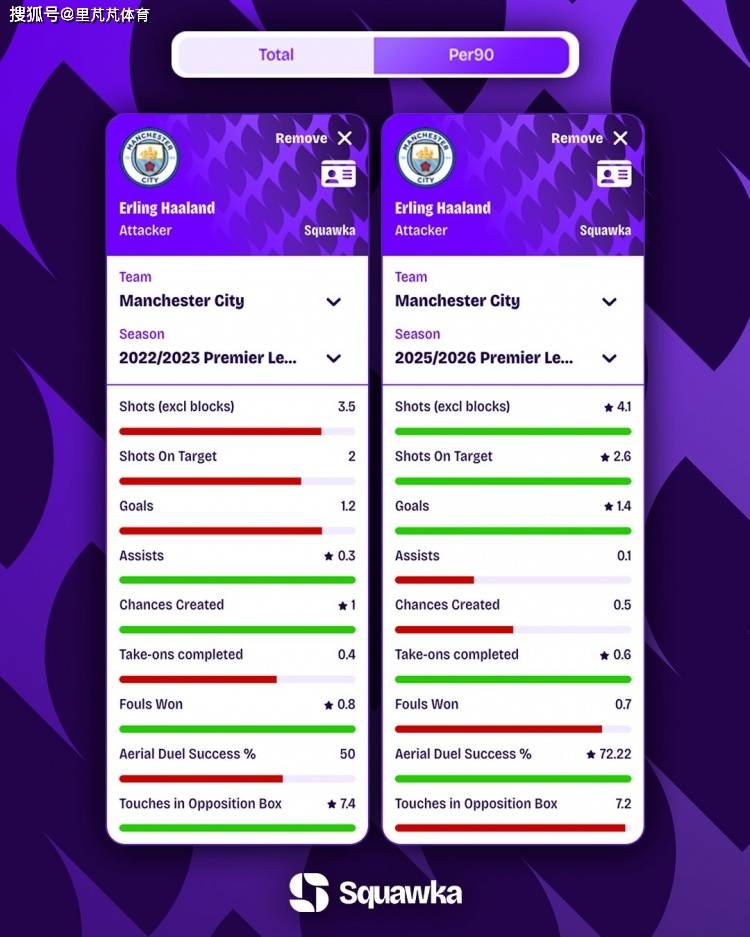 Squawka ได้รวบรวมและเปรียบเทียบสถิติของเออร์ลิง ฮาแลนด์ จากฤดูกาล 2022-23 (ซึ่งเขาทำลายสถิติพรีเมียร์ลีกด้วยการทำ 36 ประตู) กับฤดูกาลปัจจุบันของเขา