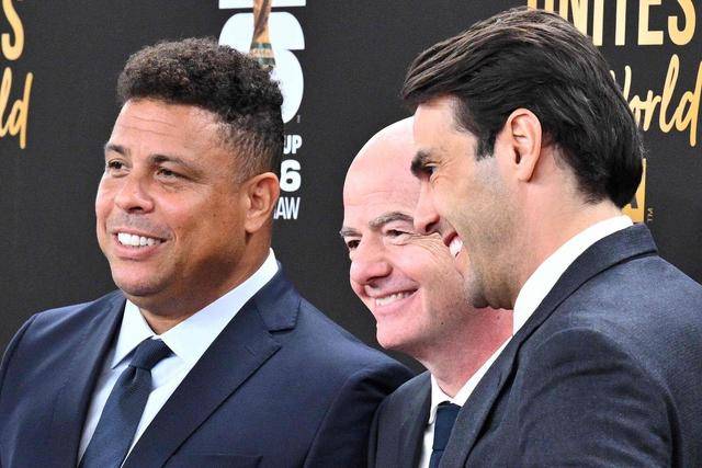 ประธานฟีฟ่า จานนี อินฟานติโน (กลาง) ถ่ายภาพร่วมกับตำนานฟุตบอลบราซิลสองคน โรนัลโด้ (ซ้าย) และ กาก้า