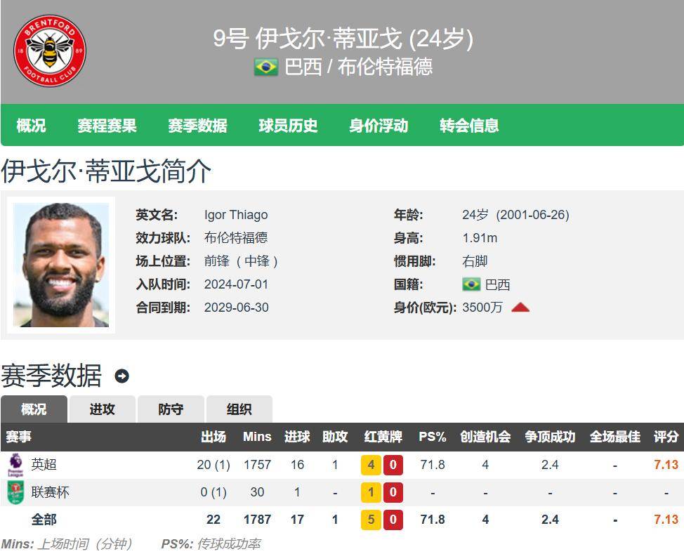 อิกอร์ ติอาโก้ ปัจจุบันอายุ 24 ปี อยู่ในช่วงพีคของอาชีพการเล่นฟุตบอลของเขา ด้วยความสูง 1.91 เมตร เขาเป็นกองหน้าตัวเป้าที่ถนัดเท้าขวา และมีมูลค่าประเมินจาก Transfermarkt อยู่ที่ 35 ล้านยูโร ซึ่งคาดว่าจะเพิ่มขึ้นอย่างมากในครั้งต่อไปอิกอร์ ติอาโก้ ได้ลงเล่นในพรีเมียร์ลีกครบทั้ง 21 นัดในฤดูกาลนี้ โดยเป็นตัวจริง 20 นัด และมีส่วนร่วมในการทำประตู 16 ประตูและทำแอสซิสต์ 1 ครั้ง นี่ไม่ทำให้เขาแข็งแกร่งกว่ากองหน้าของอาร์เซนอล ยูริ ยูริเยวิช หรือกองหน้าของแมนเชสเตอร์ ยูไนเต็ด เชชโก อย่างมากหรือ?