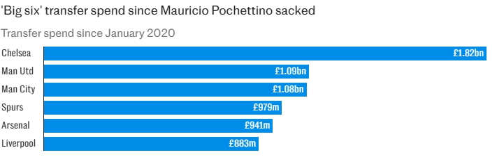 การใช้จ่ายในการซื้อขายนักเตะของหกทีมใหญ่พรีเมียร์ลีกหลังการจากไปของโปเช็ตติโน่: