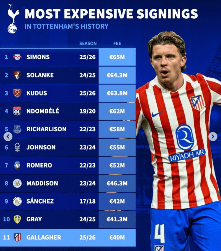 10. กัลลาเกอร์ (ท็อตแนม ฮอตสเปอร์), ฤดูกาล 2025–26, 40 ล้านปอนด์