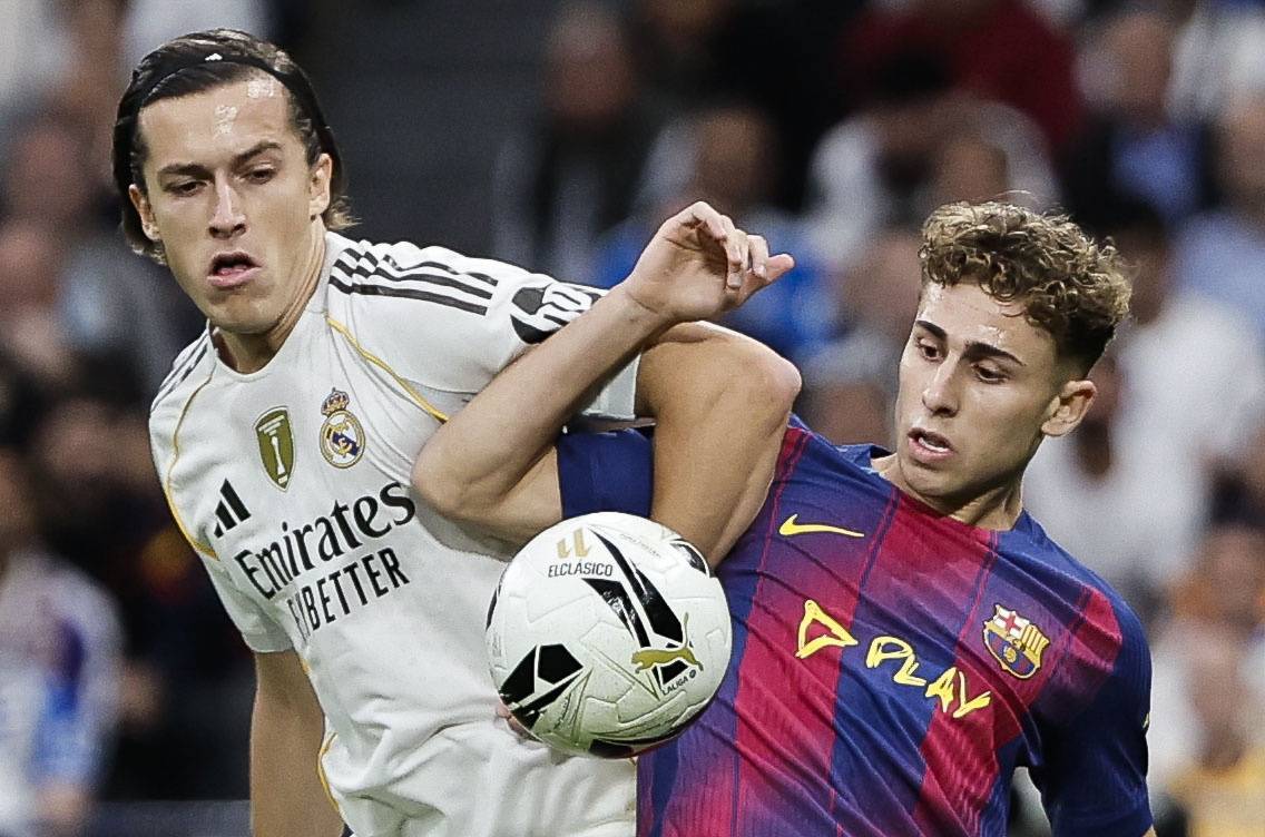 เมื่อวันที่ 26 ตุลาคม เอดูอาร์โด้ กามาวินก้า ของเรอัล มาดริด (ขวา) เข้าแย่งบอลกับ เปดรี ของบาร์เซโลนา ซีนา/EPA