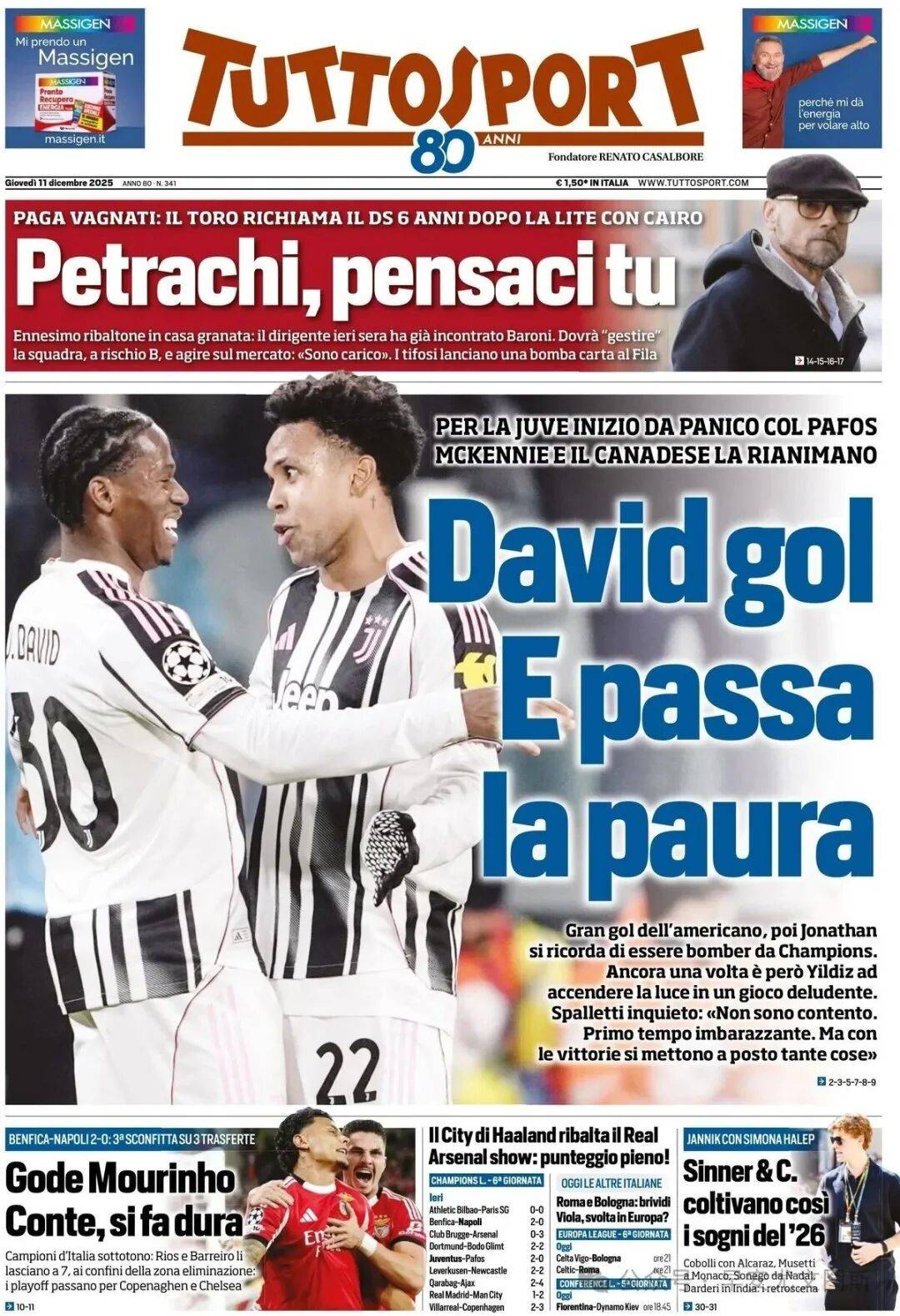 1.เป้าหมายของเดวิดขจัดความกลัวออกไป การเริ่มต้นของยูเวนตุสกับปาฟอสเป็นเรื่องน่าตกใจ แต่แม็คเคนนี่และชาวแคนาดาช่วยรักษาทีมหญิงชราไว้ได้ การยิงที่ยอดเยี่ยมของชาวอเมริกัน จากนั้นโจนาธานเตือนเราว่าเขาคือนักฆ่าในแชมเปี้ยนส์ลีกแต่แล้วอิลดิซต้องทำลายความเงียบอีกครั้งท่ามกลางการเล่นที่ไม่น่าพอใจสปัลเล็ตติกังวล: "ผมไม่พอใจ ครึ่งแรกน่าอับอาย แต่ชัยชนะนี้แก้ไขปัญหาหลายอย่าง"